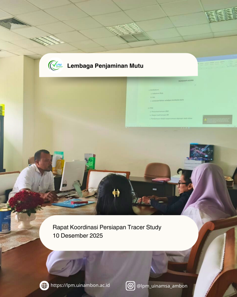 Lembaga Penjaminan Mutu (LPM) UIN A.M. Sangadji Ambon telah melaksanakan Rapat Koordinasi Persiapan Pelaksanaan Tracer Study pada Rabu, 10 Desember 2025, bertempat di Ruang Rapat LPM. Rapat tersebut menghasilkan beberapa kesepakatan penting, antara lain:
